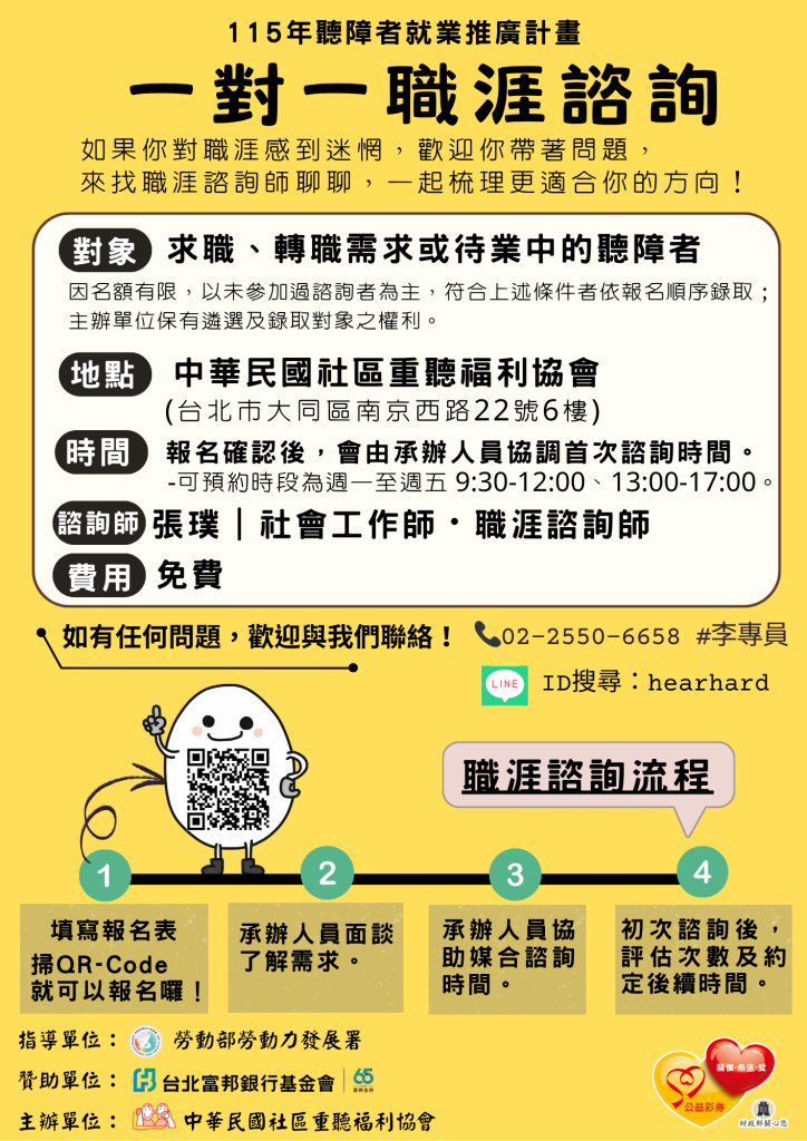 我們提供專為聽損者設計的一對一職涯諮詢服務,以及專業的職涯諮詢師陪你一起釐清目標、探索可能,找到適合自己的職涯路。